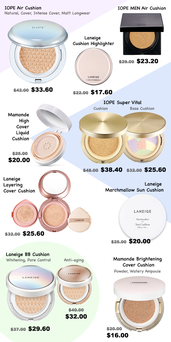 20% Sale on cushion products by Mar 18, 2018 - IOPE, Laneige, Mamonde, Hanyul